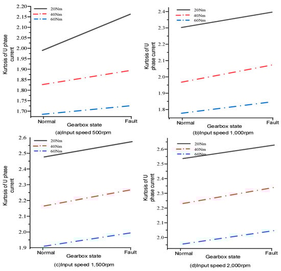 Figure 5. For example, when the motor speed is 1500 rpm with a load torque of 40 Nm, the kurtosis value of the U−phase current is 2.16 when the gearbox is normal, and the value increases to 2.26 when wear occurs on the tooth surface. A comparable phenomenon is observed at other speeds of 500 rpm, 1000 rpm, and 2000 rpm. This shows that kurtosis analysis of phase current signals provides better diagnosis of gearbox models.