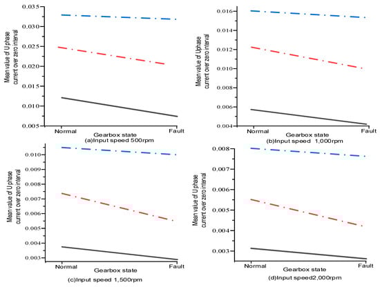 Figure 9, we can see that the zero−crossing point of the U−phase current signal is influenced not only by the load but also by the fault state of the gearbox. For instance, when the gearbox is normal, and the load torque is 20 Nm, 40 Nm and 60 Nm with the speed of 1000 rpm, the U−phase zero crossing time is 0.0056 s, 0.0145 s and 0.0165 s, respectively: the U−phase zero−crossing time increases gradually with the increase in the load. In addition, the wear of the tooth surface will also lead to a change in the U−phase zero−crossing time, which will result in the time of the zero crossing being significantly smaller. For example, when the motor speed is 1000 rpm, and the load torque is 20 Nm, 40 Nm, and 60 Nm, the average time of the zero−crossing point of the U−phase current for gearbox tooth wear faults is 0.0042, 0.0119 s, and 0.0148 s, respectively.