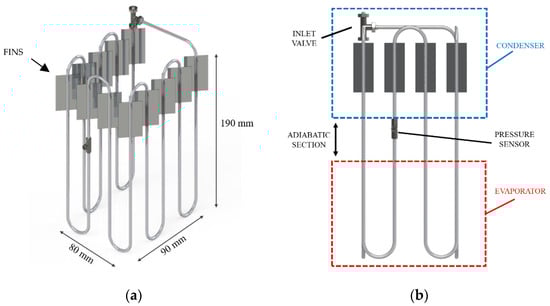 However, advanced thermal management solutions often increase the cost of battery packs. Developing affordable strategies without compromising performance remains a significant challenge [25]. In this regard, PHPs offer several benefits over other two-phase passive thermal devices, like conventional heat pipes and loop heat pipes. These benefits include simple construction, light weight, flexibility, and the lack of an internal wick structure [26,27]. PHPs are made up of a capillary tube bent multiple times between an evaporator and a condenser. The inner diameter or channel hydraulic diameter is small enough to maintain the working fluid as a mix of liquid slugs and vapor plugs. Heat transfer occurs through the self-generated oscillations of slug/plug flow between the evaporator and condenser. PHPs can use low-cost, commercially available tubes without special processing, making their manufacturing costs lower than other two-phase thermal devices. By increasing the number of turns in PHPs, the surface area of the condenser and evaporator can be expanded, enhancing heat transfer capacity. Utilizing PHPs in heat exchangers allows for the development of lighter and more compact equipment, making PHPs an attractive solution for BTMS.