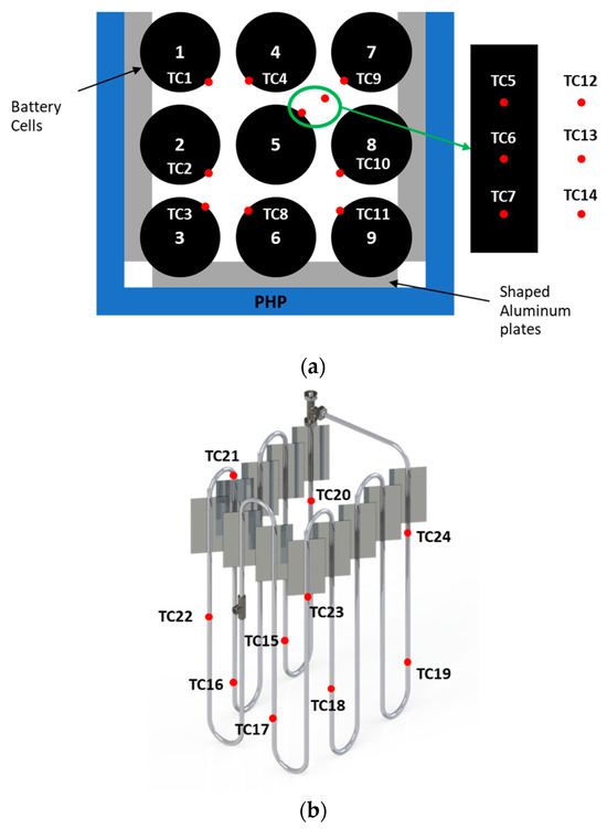 Position of the thermocouples on the battery pack (a) and on the PHP (b).