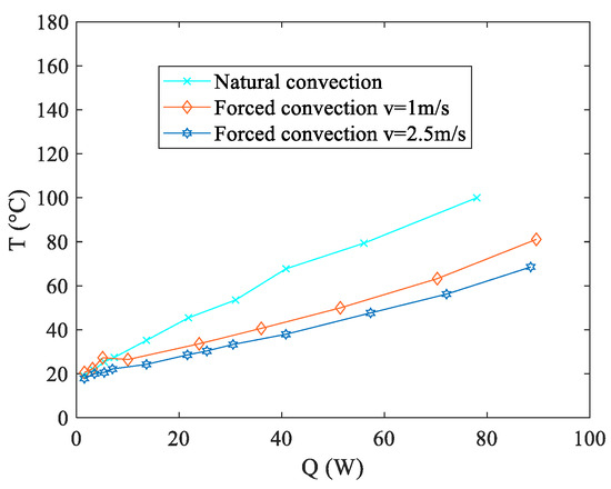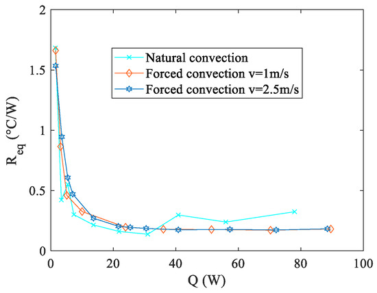 In the formula, represents the average temperature measured by the thermocouples at the evaporator, while signifies the average temperature at the condenser (as depicted in Figure 3b). Specifically, referring to Figure 3, the average temperature at the evaporator is calculated as the mean of the temperature values measured by thermocouples TC15–TC19, while the average temperature at the condenser is represented by the mean of the values measured by thermocouples TC20–TC24. Q denotes the electric power input provided to the wire heater. The performance evaluation of the proposed PHP was detailed in [19], which involved testing under air cooling conditions at the condenser. Three distinct flow conditions were examined: natural convection, forced convection at 1 m/s, and forced convection at 2.5 m/s. Figure 4 and Figure 5 illustrate the Req and distributions for all arrangements tested, respectively.