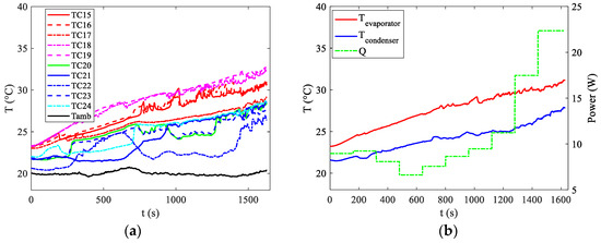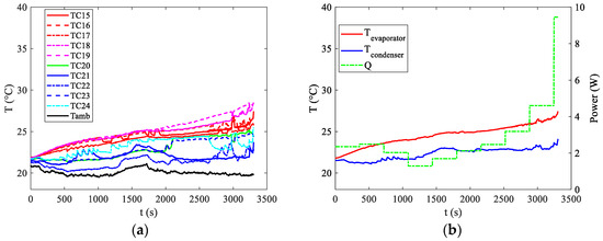 Observing Figure 4 reveals that the two setups employing forced convection at the condenser exhibit superior performance in terms of the Req. Moreover, also the configuration relying on natural convection displays promising outcomes, showcasing a thermal resistance marginally higher than those observed in the forced convection scenarios within the 40–80 W range. However, it is important to note that this natural convection configuration presents considerably elevated temperature levels at the evaporator, as illustrated in Figure 5. This characteristic holds significance within the context of the present study, as elucidated in the introductory section. Operating outside the specified temperature range (20–40 °C) significantly accelerates the aging process or may even lead to untimely structural failure. To explore the operational effectiveness of the presented thermal management device under real-world conditions, practical tests were conducted using an authentic battery pack. Three distinct discharge curves, each corresponding to various fully discharging processes, were examined. These curves were generated by maintaining a constant operational current at different magnitudes of C-rates, denoted as 1C, 2C, and 3C as described in the experimental setup section. The selection of these discharge curves as test conditions stems from the fact that Li-ion cells frequently endure demanding operating scenarios during the discharge or charge phase. These discharge curves were chosen as representative conditions to assess the viability of the presented thermal management device. Additionally, in real-world applications, the discharging current of Li-Ion batteries can fluctuate over time. Therefore, it is vital for a BTMS to maintain stable and uniform battery temperatures across various operating conditions. Notably, among the three boundary conditions explored in preliminary tests, the most challenging scenario, i.e., natural convection, was considered for these assessments. All the tests were performed in a conditioned laboratory where the temperature was kept around 20 °C. To prevent malfunctions or potential overheating, the aim of the battery thermal management system is to keep the maximum temperature below 40 °C. Figure 6a illustrates the temperature distributions recorded by all the thermocouples indicated in Figure 3b. Additionally, Figure 6b displays the average temperature readings at both the evaporator and condenser, along with the power supplied by the battery at the evaporator section.