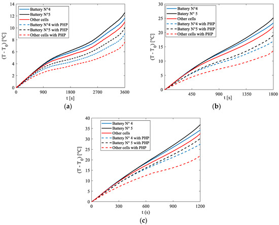 Additionally, Figure 9 also shows the same temperatures obtained in the absence of the PHP. A comparison reveals that in all cases and for all cells, the application of the PHP reduced the temperature increase. Particularly notable is the effect observed in cells other than N°4 and N°5, where direct contact with the PHP resulted in tangible benefits. For these cells, the adoption of the PHP led to temperature reductions of 3 °C, 9 °C, and 11 °C for 1C, 2C, and 3C discharge rates, respectively. These results highlight the potential of the proposed BTMS as a promising solution for electrical battery cooling.