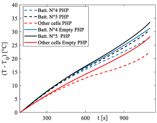 To ascertain whether the contribution of the PHP is indeed due to the latent heat related to evaporation and condensation inside the device, along with the sensible heat resulting from the oscillations that occur upon activation, another set of experiments was conducted using the same setup but with the PHP empty, i.e., without fluid inside. This approach allows for the differentiation of the effective contribution of the two-phase device from the intrinsic fin effect. Figure 10 presents the results under more rigorous conditions, specifically the 3C discharge rate. It is evident that the difference between the functioning PHP and the empty device is significant, with little disparity between the empty PHP and the absence of the PHP reported in Figure 9c.