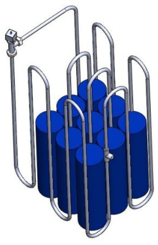 The consistent cooling demonstrated by the proposed system underscores its potential as a robust solution for managing the thermal aspects of electrical batteries. However, there are two main issues that must be addressed in the engineering of the product: firstly, under natural convection, the low heat transfer coefficient values pose a significant challenge in achieving the goal of maintaining the battery temperature within the optimal working range. In this scenario, increasing the surface area of the condenser section by implementing a more efficient and extensive fin battery pack could be a viable solution. Another significant issue pertains to temperature differentials across both the battery pack and individual battery cells, which can significantly impact the long-term performance of the battery system. Substantial temperature variations within the battery pack and at the pack level can result in varying rates of capacity fade and unbalanced voltage distribution within the pack. Therefore, maintaining a small temperature difference is crucial for Li-Ion battery packs, serving as an indicator of an effective battery thermal management system. Regarding the temperature gradient along the single cell, the here-proposed BTMS configuration does not present great problems, with a maximum difference along the central cell of less than 2 °C. On the other side, a difference in the temperature can be an issue with this setup: indeed, as it is possible to see from Figure 10, a max temperature difference among the cells is around 2.5 °C, 5.5 °C and 9 °C for 1C, 2C and 3C discharging curves, respectively. The significant temperature gradient within the battery pack primarily arises from the diverse cooling environments surrounding various sections of the pack. Cells on three sides of the pack can efficiently transfer heat to the surroundings through the PHP turns. However, the interior regions rely solely on conduction between the batteries to dissipate heat, which imposes limitations on heat dissipation. This limit can be overcome by inserting some turns inside the different rows of cells, as sketched in Figure 11. The new setup is in the phase of production, and it will be tested in the next months.