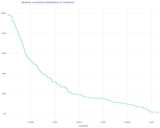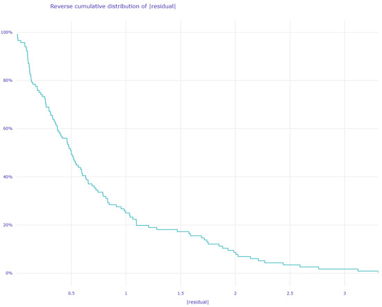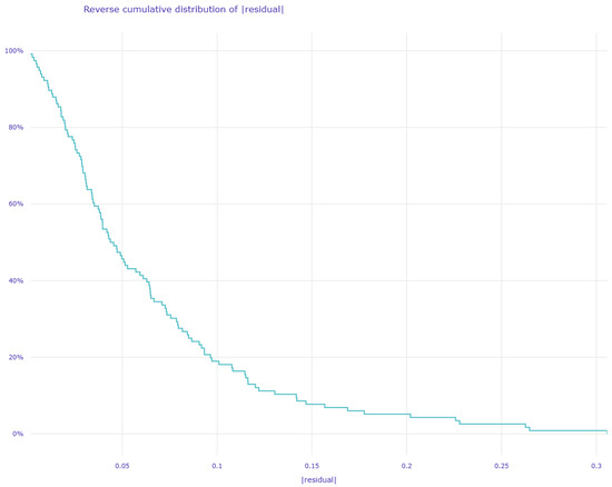 This section focuses on the forecasting machine learning technologies (SVR, CatBoost and XGboost). Furthermore, the Shapley additive explanation (SHAP) method is used to explain the effect of the energy, economic policy uncertainty indices and geopolitical risk variables on bitcoin energy consumption. Jabeur et al. [46,52] and (Zaghdoudi et al. [45]) concluded that the Shapley additive explanation approach can be utilized by policymakers and investors to understand complex ML outcomes. However, in this study, we use the DALEX Python package proposed by Biecek and Burzykowski [43] to explain the SVR, XGboost and CatBoost models. With DALEX, we analyzed model performance based on the distribution of residuals by comparing the differences between observed and predicted probabilities as residuals. The reverse cumulative residual plots displayed in Figure 5, Figure 6 and Figure 7 show that residual distribution from XGBoost appear to be the lowest compared to SVR and CatBoost models. Therefore, the XGboost model is the most efficient to forecast the bitcoin energy consumption.
