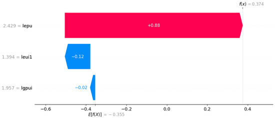 The SHAP values for the effective ML tool XGboost are shown in Figure 4. This is accomplished by ordering the features based on the sum of the SHAP amplitudes over all samples. The SHAP values are then utilized to indicate the distribution of each feature’s impacts on model output. Each color informs us about the effect of the input variable on the output, either positive in red or negative in blue. However, in terms of predicting, variables are ordered based on their value in influencing bitcoin energy consumption. Each row depicts a feature. A redder shape indicates a higher value, whereas a bluer shape indicates a lower value. The SHAP values are plotted on the abscissa. Furthermore, a positive SHAP value reflects a positive input–output effect, while a negative SHAP value indicates a negative input–output effect. As observed in Figure 9, lepu is the most important feature which leads to a positive forecast of bitcoin energy consumption. This means that an increase in the economic policy uncertainty stimulates bitcoin energy consumption. Significant economic policy uncertainty could prompt investors to seek alternative assets such as bitcoin as a hedge against traditional financial markets or currencies perceived as risky in times of turmoil. Furthermore, economic policy uncertainty can affect global economic patterns, impacting the valuation of bitcoin, which is often considered a global asset independent of a specific country’s policies. In addition, more consideration for bitcoin means an increase in the number of transactions and validations, and consequently more energy consumption. Oterwise, energy uncertainty (leui1) appears in the second position, which negatively impacts the bitcoin energy consumption. An increase in energy uncertainty decreases bitcoin energy consumption. Thus, the number of transaction validations retracts as energy uncertainty increases. That is, bitcoin becomes less attractive when there is uncertainty about the availability of fossil fuels such as oil, natural gas or coal due to the depletion of reserves or geopolitical tensions affecting supply routes. However, results indicate that the geopolitical risk has a negative weak feature importance in forecasting bitcoin energy consumption.