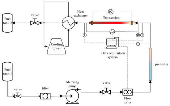 In the entire system, a Coriolis flow meter (DMF-1-1, 0.15%) was used to measure the mass flow rate of the fuel in the tube. The static pressure at the heating entrance section was measured by a pressure transmitter (3051C, Rosemount, Shakopee, MN, USA) with a range of 0–16 MPa and an accuracy of 0.3%. The pressure was controlled by a back-pressure valve (0–15 MPa) in the system. Ten pairs of K-type thermocouples, with an accuracy of 0.5 K, were welded to the upper and lower surfaces of the entire heating-test section, and the data were recorded to a computer via the IMP 3595-4C system.