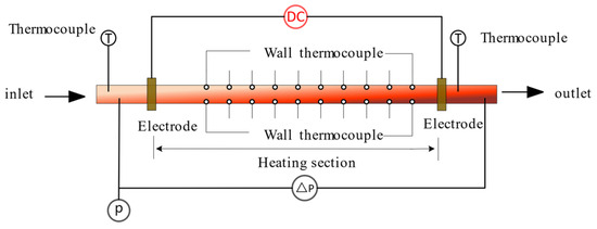 Figure 2 shows a schematic of the experimental section. The section consists of a horizontally oriented 316L stainless steel tube (00Cr17Ni14Mo2), with an inner diameter of 2 mm, an outer diameter of 3 mm, and a length of 1000 mm. To minimize the influence of the inlet effects on the experiments and to ensure fully developed flow within the tube, the first 100 mm of the experimental section are designed as an adiabatic segment, while the following 900 mm serve as the heating segment. It should be noted that the term “fully developed flow” in this article refers to fully developed flow in fluid dynamics. Temperature-measurement sections are established every 100 mm along the heating segment, where K-type thermocouples are spot-welded to the external surface for temperature monitoring.