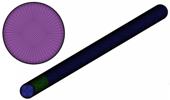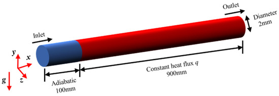 Due to numerous limitations of the experiments, analyzing the heat-transfer mechanisms of supercritical hydrocarbon fuels solely based on partial wall temperature data and similar metrics remains insufficiently clear. Computational fluid dynamics (CFD) offers a more detailed and convenient method for obtaining numerical values throughout the convective heat-transfer process. Therefore, this study will employ the open-source software package OpenFOAM-v9, integrated with a custom-compiled thermophysical properties library, to simulate the convective heat-transfer process of supercritical RP-3 in a horizontal tube. The physical model and the experiment are kept consistent. The physical model is depicted in Figure 3. The tube has an inner diameter of 2 mm and a length of 1000 mm, with the first 100 mm being an adiabatic section and the remaining 900 mm a heated section. The purpose of the adiabatic section is to change the flow of fuel entering the heating section into a fully developed flow. The direction of gravity is downward along the y-axis.