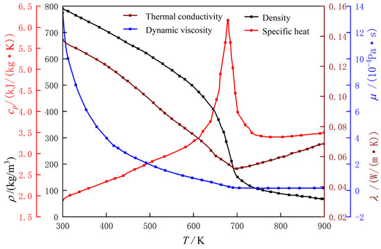 This study focuses on RP-3 aviation kerosene, the most widely used fuel in domestic aircraft engines. RP-3 has a critical temperature of 645.04 K and a critical pressure of 2.33 MPa [28]. Given the highly complex composition of aviation kerosene, researchers have traditionally used component-substitution models to handle its thermophysical properties. This approach involves representing the complex aviation kerosene with a few main components and calculating its thermophysical properties based on their mass or molar fractions. Although this method simplifies the handling of the thermophysical properties of aviation kerosene, different substitution models have varying applicabilities and still contain some errors. Considering that researchers, such as Deng et al. [29,30,31,32], have measured refined thermophysical properties of RP-3 within a certain temperature range, this study constructs a new thermophysical properties library by tabulating the measured data, including density, specific heat at constant pressure, dynamic viscosity, and thermal conductivity against temperature. This new library is developed and integrated into OpenFOAM to create a new solver that is invoked during the simulation of heated RP-3. Figure 4 illustrates the thermophysical properties of RP-3 at 3 MPa.