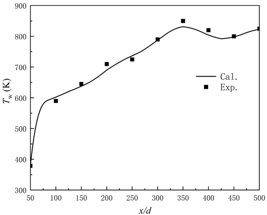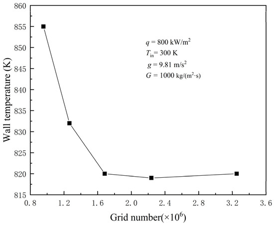 The quality of the mesh directly determines the accuracy of the numerical simulation results. A low-quality mesh can lead to larger simulation errors, while a mesh with excessively high quality can increase the simulation time and waste computational resources. Therefore, mesh independence verification is necessary to determine the appropriate mesh generation method. Figure 5 shows a schematic diagram of the mesh. It is important to note that the turbulent equations are highly sensitive to the near-wall region of the mesh. It is necessary to ensure a dimensionless distance of y+ ≤ 1 To achieve this, the first layer’s mesh thickness is fixed at 0.008 mm with a growth rate of 1.1. The number of axial and radial grid lines is varied to create four different meshes with 0.95 M, 1.26 M, 1.68 M, 2.24 M, and 3.25 M elements. The wall temperature at the outlet is used as a key parameter for comparison, as shown in Figure 6. It can be seen that the results of the 0.95 M and 1.26 M meshes have larger errors compared to the 1.68 M mesh. The difference in the outlet wall temperatures between the 1.68 M, 2.24 M, and 3.25 M meshes is less than 2 K. Therefore, the mesh with 1.68 M elements is deemed appropriate. After determining the mesh size, it is necessary to compare the simulation with experimental results to verify the accuracy of the simulation settings and methods. Figure 7 shows a comparison of the simulated and experimental wall temperatures under the condition of a mass flux of 1000 kg/(m2∙s), an inlet pressure of 3 MPa, an inlet temperature of 300 K, a gravitational acceleration of 9.81 m/s2, and a heat flux of 800 kW/m2. The maximum error is 2.90%, indicating that the mesh and methods used in this study are relatively accurate. Since RP-3 aviation kerosene undergoes significant thermal cracking reactions at around 860 K [36], in order to make the simulation as close to reality as possible, the temperature throughout the pipe is limited to below 860 K when setting different simulation conditions in the future.