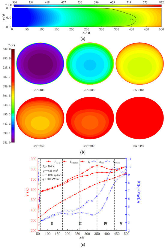 This section conducts a detailed analysis under typical conditions, with a heat flux of 800 kW/m2, mass flow rate of 1000 kg/(m2·s), inlet pressure of 3 MPa, inlet temperature of 300 K, and gravitational acceleration of 9.81 m/s2. It also elaborates on the heat-transfer mechanisms involved in these settings.
