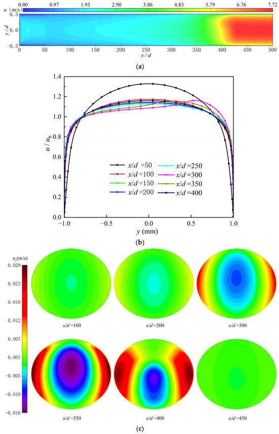 Velocity distribution map. (a) z = 0 cross-sectional velocity contour maps. (b) Dimensionless velocity. (c) contour maps of the uy component across different cross-sections.