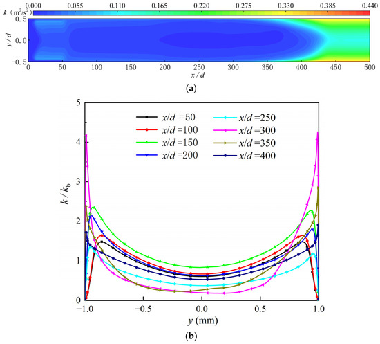 Distribution of turbulent kinetic energy. (a) z = 0 cross-sectional turbulent kinetic energy contour map. (b) Dimensionless turbulent kinetic energy.