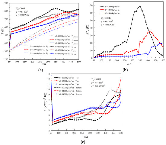 Figure 11a–c displays the effects of varying mass flux on wall temperature, fluid temperature, wall temperature difference, and heat-transfer coefficients, under the operational conditions of a heat flux of 800 kW/m2, an inlet pressure of 3 MPa, an inlet temperature of 300 K, and a gravitational acceleration of 9.81 m/s2.
