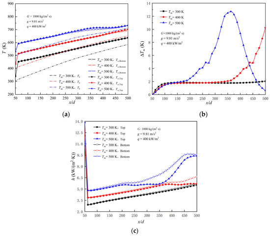 Figure 12a–c each depict the impact of varying inlet temperatures on wall temperature, fluid temperature, wall temperature difference, and heat-transfer coefficients under the conditions of a heat flux of 400 kW/m2, a mass flux of 1000 kg/(m2·s), an inlet pressure of 3 MPa, and gravitational acceleration of 9.81 m/s2.