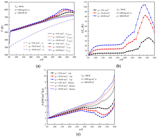 Figure 13a–c illustrates the effects of different gravitational accelerations on wall temperature, fluid temperature, wall temperature difference, and heat-transfer coefficients under conditions of a heat flux of 600 kW/m2, a mass flux of 1000 kg/(m2·s), an inlet pressure of 3 MPa, and an inlet temperature of 300 K.