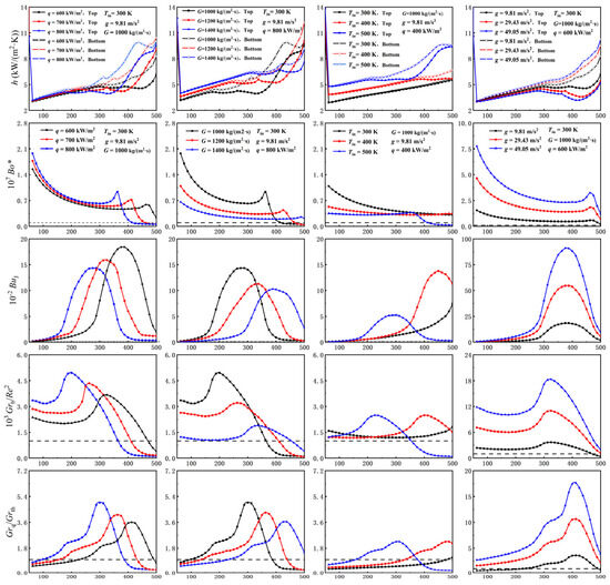 Figure 14 illustrates the variations of different buoyancy criterion numbers under various conditions along the flow path. Columns 1 to 4 correspond to different conditions of heat flux, mass flux, inlet temperature, and gravitational acceleration, while rows 2 to 5, respectively, correspond to four different buoyancy criterion numbers. To facilitate the observation of the performance of various dimensionless buoyancy criteria, the first row of Figure 14 shows the variation of the heat-transfer coefficient along the length for each operating condition. From Figure 14, it can be observed that Bo* is almost ineffective for predicting the buoyancy in horizontal tubes; its only advantage lies in its relatively precise prediction of the peak position of buoyancy. This indicates that, due to the differing impacts of buoyancy on heat transfer in vertical and horizontal tubes, the criterion numbers cannot be interchangeably used. For Grb/Re2 and BuJ, although their overall trends and previous analyses are similar, both display unreasonable aspects. BuJ, when predicting buoyancy under varying heat-flux densities and inlet temperatures, shows a decrease in peak values with increasing heat flux and an increase with decreasing inlet temperature, which is inconsistent with heat-transfer processes and might be related to its expression containing (x/d)2. Moreover, its threshold values are overly conservative. Grb/Re2 tends to overestimate the effect of buoyancy at the inlet and also introduces the buoyancy peak too early, again demonstrating issues with conservative threshold values. In comparison, Grq/Grth quite perfectly aligns with the trends in buoyancy changes throughout the different stages of the heat-transfer process, distinctly presenting two deteriorations in heat transfer. It neither overestimates the influence of buoyancy at the inlet section nor exhibits any numerical inconsistencies during the heat-transfer process. However, there are some deviations in the positioning of the buoyancy peak.
