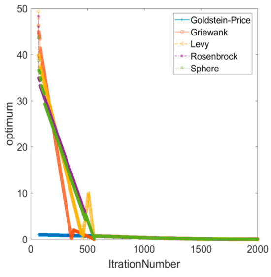 Figure 4 respectively show the convergence curves at different numbers of population iterations. The PSO algorithm was validated using benchmark functions. Five common benchmark functions were selected to test the algorithm. The sphere function was used to evaluate the convergence efficiency of the algorithm; the Rosenbrock function was used to assess the evaluation accuracy of the algorithm; the Levy function and Griewank function, both multimodal benchmark functions, were used to test the algorithm’s performance in the presence of multiple local optima; the Goldstein–Price function was employed to examine the algorithm’s global search capability.