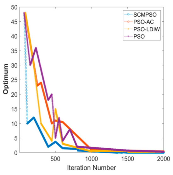 Figure 6 shows that the SCMPSO algorithm demonstrates significant advantages early in the iteration process. When the iterations reach around 500, the results of the four particle swarm optimization algorithms converge to approximately zero. To ensure the reliability of the algorithm, the number of iterations should not be less than 500. In this study, 2000 iterations were selected to avoid the potential issue of insufficient iterations compromising the validation of the algorithm’s effectiveness.