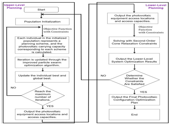 Figure 2 provides a detailed introduction to the two-level planning framework for distributed photovoltaics. The PV model planning mentioned in this paper is divided into two levels. The upper-level planning mainly focuses on maximizing the load-bearing capacity of the distribution network. It establishes a planning model by combining the investment costs of the distributed PV with the system active power loss to determine the siting and sizing of PV equipment. The lower-level planning, on the other hand, aims to reduce the system active power loss, improve the system stability margin, and minimize the voltage deviation. This is achieved by solving the model using an improved second-order oscillating chaotic mapping particle swarm optimization algorithm. The siting and sizing of equipment determined by the upper-level planning become the initial conditions for the lower-level optimization. The results of the lower-level planning are then fed back to the upper level, further optimizing the installation locations and capacities of the PV equipment.
