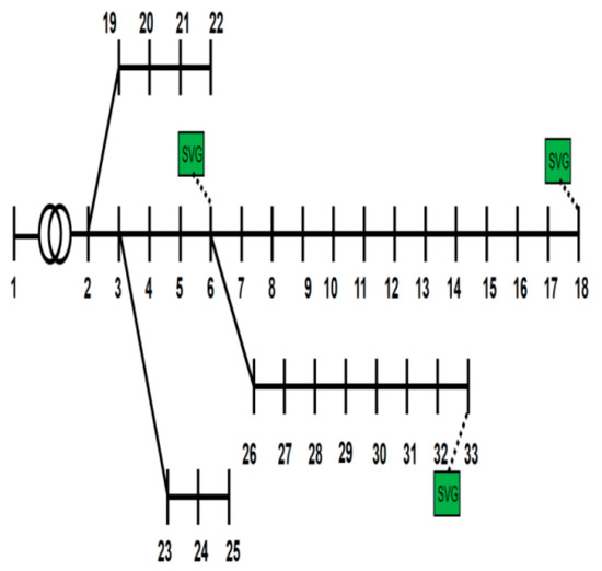 This study uses the improved IEEE-33 node distribution network system, as shown in