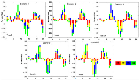Scenarios 4 and 5: The loads in these scenarios are nearly identical; however, due to meteorological variations, the PV output in Scenario 5 is greater than in Scenario 4. Despite similar timings for charging and discharging the energy storage devices, the power levels vary. This indicates that Scenario 5 may require the more dynamic management of energy storage due to higher PV outputs, potentially leading to more aggressive charging strategies or faster discharge rates to stabilize the grid.