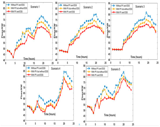 Figure 11, energy storage devices are in charging mode during the night and early morning. However, due to the low load and minimal losses during these times, there is not much additional power loss. Thus, in the initial stages of all five scenario graphs, the curves for the three operating states almost coincide. Daytime with increasing load: As the system load increases, the actions of PV and energy storage devices cause changes in active power loss over time, leading to deviations among the three curves. Scenarios 1, 2, and 3 exhibit lower PV output and, consequently, lower system power loss compared to Scenarios 4 and 5. Scenarios 4 and 5 experience the highest system loads and the greatest PV output. As a result, there is a slight increase in the system power loss due to the higher energy throughput. In summary, the integration of PV and energy storage devices in the distribution network significantly mitigates active power losses, particularly during periods of high solar output and peak loads.