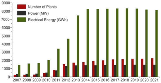 A trend of the Italian biogas installations in terms of number of plants, nominal power, and electricity production (period 2007–2021).
