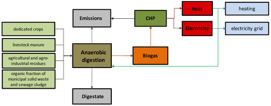If attention is focused on bioenergy, it may hold a 60% share of renewable energy sources (RES) within the EU, and a steady increase in biomass use for the production of energy (bioenergy) and fuels (biofuels) is foreseen until 2030. Biomass may be considered a stable energy source in the electricity, heat and transport sectors, thanks to the local availability of a plurality of feedstocks and reliable technologies. However, it is crucial to ensure a sustainable sourcing of biomass by relying on non-recyclable biomass waste and agricultural and forestry residues [5]. If dedicated crops (such as corn, grasses, beets, sunflowers, etc.) in past decades, which are defined as “energy crops”, were widely used for energy purposes [6], in recent years, for sustainability reasons, interest has shifted towards the use of wastes from agricultural industries that are unsuitable for animal feed, agribusiness wastes, processing wastes and expired food, destined to be not subsequently used in any other way. In particular, biogas, defined as “a gas consisting mainly of methane and carbon dioxide produced by the anaerobic digestion of biomass” [7], can be produced from (i) landfill gas, produced by waste digestion; (ii) sewage sludge gas, produced by anaerobic fermentation of sewage sludge and wastewater treatment; and (iii) anaerobic fermentation of agricultural waste, livestock manure, and residues from agri-food farms [8]. In doing so, biogas production by means of Anaerobic Digestion (AD) not only provides a valuable RES, but it also helps solve the problem of waste disposal, which currently threatens ecosystems and human health, by mitigating some of the environmental impacts generated from biowaste management [9].