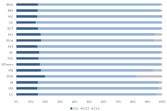 Percentage contribution to the total impacts of electricity production from biogas in Italy in 2021, coming from CL1 (biogas from agricultural and forestry biomass and animal manure in plants with a nominal power 1–700 kW), CL2 (biogas from agricultural and forestry biomass and animal manure, in plants with a nominal power 701–1700 kW), and CL3 (biogas from waste and sludge).