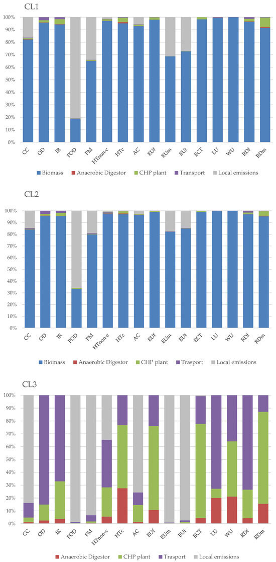 An analogous trend is also observed for the CL2 class (Figure 6), with the biomass supply resulting as the main responsible for the generated environmental impacts (90% as the average value of contribution across all investigated impact categories), followed by local emissions that provide significant impacts, especially on POD (66%), PM (19%) and EUm (18%). An in-depth analysis has demonstrated that, out of the different types of biomasses included in this assessment (namely maize, sweet sorghum, rye, barley, and wheat), the production of maize represents a hotspot for both CL1 and CL2, essentially due to the greater amounts of maize used in comparison with the other types of biomasses. The impacts attributed to CL3, instead, cannot be associated with the biomass used as feedstock since a zero-burden approach has been adopted for waste biomass and sludge. Therefore, in the case of CL3, local emissions predominantly affect the largest number of impact categories, especially POD and EUm, with contributions of 99%, whereas the impacts from transport are particularly relevant for OD and RDf. The CHP plant is more impactful than the anaerobic digestor, with an average contribution of 26% versus 7% across all the investigated impact categories.