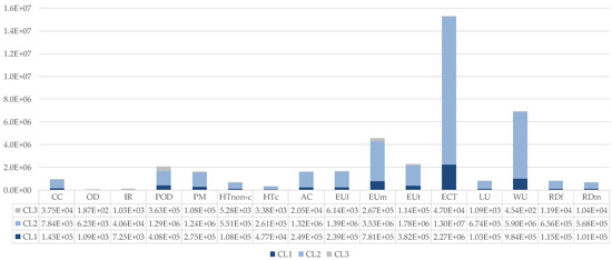 Contributions (in absolute values) to normalized impacts of electricity production from biogas in Italy in 2021, coming from CL1 (biogas from agricultural and forestry biomass and animal manure, in plants with a nominal power 1–700 kW), CL2 (biogas from agricultural and forestry biomass and animal manure, in plants with a nominal power 701–1700 kW) and CL3 (biogas from waste and sludge).
