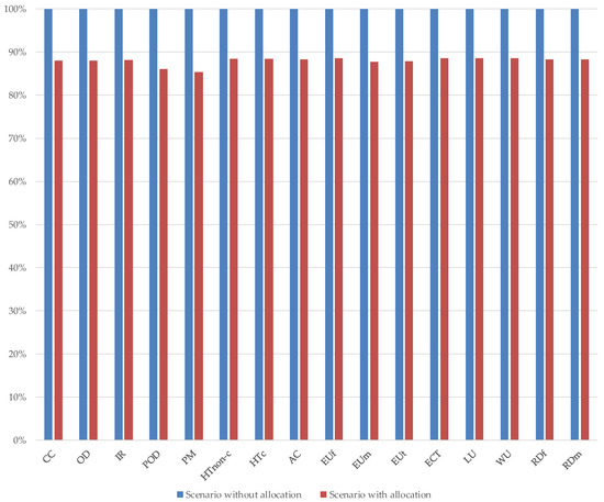 In the present study, the sensitivity analysis has been aimed, first of all, at validating the methodological choices—in particular, the allocation procedure applied to electricity and heat, co-produced by means of CHP. Given that the heat generated in the cogeneration process and not self-consumed is not usually considered a co-product, as it is assumed to be dissipated, the basic scenario in which the impacts are allocated between heat and electricity (scenario with allocation) has been compared to an alternative scenario in which no allocation is applied (Figure 8). In the latter scenario (without allocation), the electricity sold to the national grid is the only product accounted for.