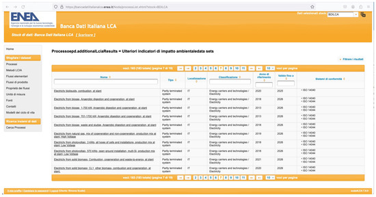 - Banca Dati Italiana LCA. Available online: https://bancadatiitalianalca.enea.it/Node/ (accessed on 27 February 2023).