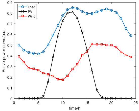 The main objective of this study was to assess the value of the hosting capacity interval of the distribution network for newly installed distributed power sources of renewable energy types. In order to verify the validity of the interval assessment method of the distribution network’s hosting capacity for DG sources proposed in this paper, an improved IEEE 135-node distribution network, as shown in Figure 2, was used for the simulation and analysis and the six distributed power sources with a capacity of 1 MW in the distribution network topology diagram were gas turbines or diesel generators. Four renewable energy access points were planned, with node 49 and node 59 accessing PVs and node 44 and node 73 accessing wind turbines. The desired curves of the loads and renewable energy sources (PV and wind turbine) are given in Figure 3. The capacity of the BESS was 2 MW and it was connected to node 90, node 129, node 116, and node 125. The system reference voltage was 13.8 kV, and the reference capacity was 10 MVA. The upper and lower limits of the nodal voltages of the distribution network were set to 1.05 p.u.–0.95 p.u.