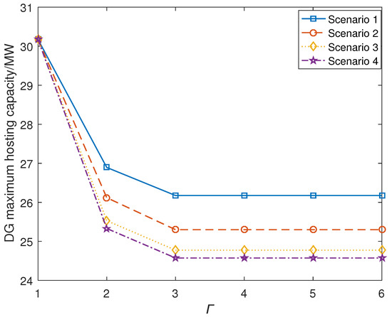 According to robust optimization theory, the larger the value of the uncertainty budget is, the more conservative the whole model evaluation result is, which means that the maximum access capacity of DG that can be connected to the distribution network is smaller. Conversely, the larger the value of , the larger the capacity that can be accessed. The relationship between the maximum accessible capacity of DG that can be connected to the distribution network and the parameter is specifically analyzed below, and the simulation results are shown in Figure 4. When ≤ 2, the maximum access capacity of the distribution grid to DG sources increased rapidly in each scenario as the uncertainty parameter decreased. When = 0 was the most optimistic case, the maximum capacity value of DG accessed in each scenario was the evaluation result of optimistic model I, which was regarded as the upper bound of the DG hosting capacity interval; when 2 < < 5, the maximum access capacity of the distribution grid for DG sources decreased rather slowly in each scenario as the uncertainty parameter increased. When = 5, in this zone, the robust conservative degree was the most pessimistic situation, and the DG maximum access capacity value, that is, the pessimistic model II assessment result, was regarded as the lower boundary of DG hosting capacity interval. At the same uncertainty budget value, the maximum access capacity of DG sources decreased sequentially for scenario 1, scenario 2, scenario 3, and scenario 4. This means that the fewer the number of fluctuating DG units at the same moment of time with the same uncertainty budget, the more favorable the lower bound of the hosting capacity interval.