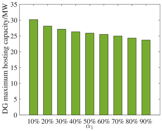 The impact of the confidence parameter on DG hosting capacity interval 2 constituted by optimistic model I and pessimistic III sub-model is shown in Figure 5. With the growth of , the range of changes in the likelihood of the renewable energy conservative access scheme increased. This was due to the fact that the higher the , the higher the probability of selecting a DG conservative access program and the smaller the results of the DG hosting capacity assessment of the corresponding access program. When = 90%, that is, the most pessimistic scenario, at this time, the DG assessment produced 23.713 MW as the lower boundary of the hosting capacity interval 2; when = 10%, that is, the optimistic scenario, at this time, the DG assessment produced 30.175 MW as the upper boundary of the hosting capacity interval 2. By changing different access schemes, the maximum capacity of DG that could be accessed by the system varied within the range of [23.713, 30.175] MW.