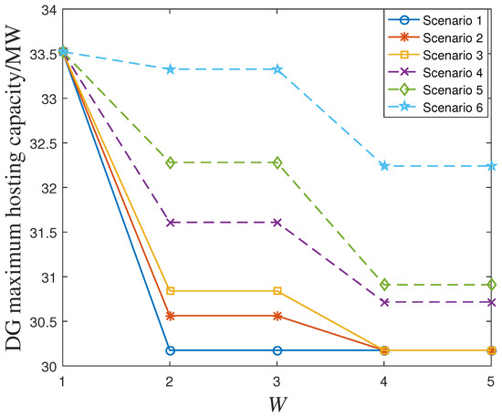 When W ≤ 2, the maximum access capacity of the distribution grid for DG sources increased rapidly in each scenario as W decreased. When 4 ≤ W ≤ 5, in addition to scenario 6, for each scenario relative to W = 2, when the maximum access capacity of DG was reduced, at this time, the model with the highest degree of robust conservatism was the most pessimistic scenario, that is, the maximum access capacity of DG value was found in the pessimistic model IV assessment results. This value was regarded as the lower bound of DG hosting capacity interval 3. When W < 4, the maximum access capacity of the DG in scenario 1, scenario 2, scenario 3, scenario 4, scenario 5, and scenario 6 decreased sequentially with the increase in the repair fault repair time. Therefore, the fault repair time was also an important factor that affected DG access capacity interval 3.