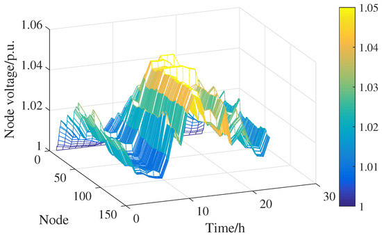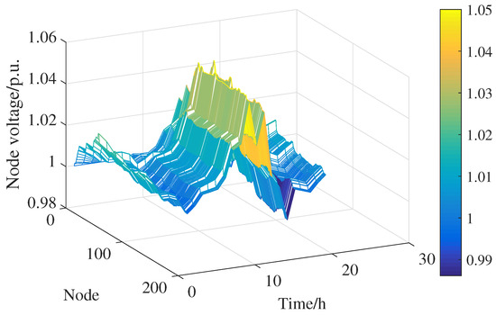 The following Figure 7 and Figure 8 show the voltage distributions with and without access to flexible resources when evaluating the lower bound of DG hosting capacity interval 1. The maximum system voltage offset was reduced from 5% to 3.9% after the flexible resources were connected compared with the before situation. Since the corresponding energy storage and SVG active and reactive outputs could be adjusted to support the access of DG resources, the current distribution of the system improved, and the voltage fluctuation was smoothed out; thus, the DG hosting capacity interval was improved.