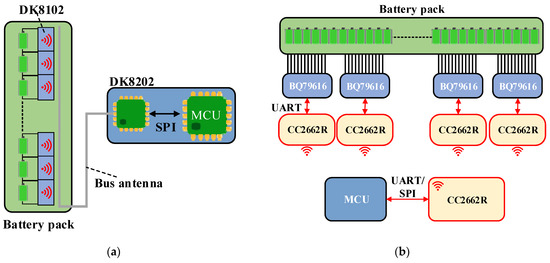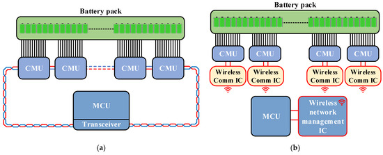 Architectures of wired and wireless BMS: (a) wired BMS architecture and (b) wireless BMS architecture.