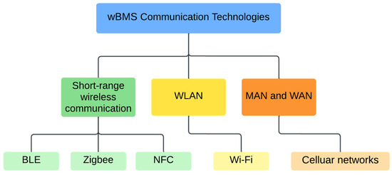 Therefore, for more precise classification, this paper groups wireless communication technologies in terms of their communication range, and they are classified into short-range wireless communication, Wireless Local Area Network (WLAN), Metropolitan Area Network (MAN), and Wide Area Network (WAN). All these wireless communication technologies have been covered to a certain extent in the existing literature. Among them, the most popular protocols in wBMSs include Bluetooth Low Energy (BLE), Zigbee, Near-Field Communication (NFC), Wi-Fi, and cellular networks. In addition, there are other customized communication protocols for wBMSs. Figure 3 depicts the detailed classification of wBMS communication protocols.