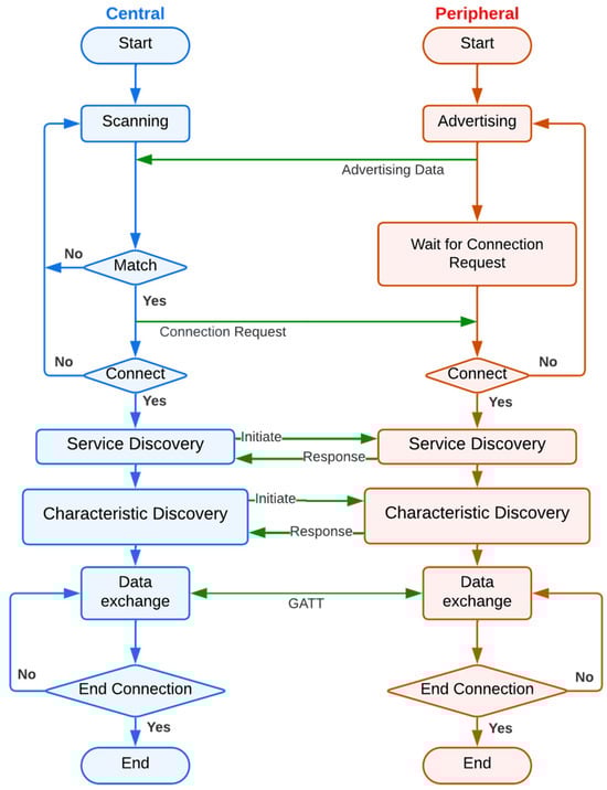 Basic Operation [32]—As shown in Figure 4, a BLE device begins by scanning for advertising signals to detect available devices and services. It can operate as either a peripheral or a central. As a peripheral, it advertises its presence and capabilities to nearby central devices, waiting for connection requests. If operating as a central, it listens for these advertisements and can initiate connections with peripherals. Upon connection, the central and peripheral devices can exchange data and utilize services like the Generic Attribute Profile (GATT) to manage their interactions. BLE supports advanced security features like encrypted communication through pairing and bonding processes to ensure secure data exchange. Devices can scan for additional connections to manage or optimize network links while connected. BLE devices also enter low-power modes during inactivity to conserve energy. Furthermore, connections are dynamically managed, allowing devices to adjust their visibility and operational status to optimize power usage and communication efficiency.