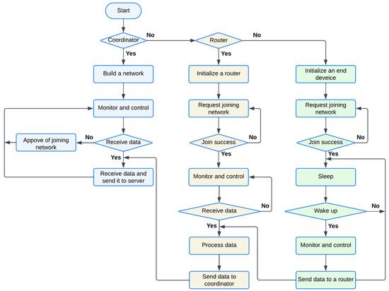 Basic Operation [39]—As displayed in Figure 6, a Zigbee device begins by searching for a network to join or deciding to create a new one. The device follows different procedures based on its role as a coordinator, router, or end device.