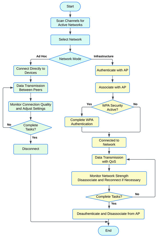 Basic Operation [48]—As depicted in Figure 9, a Wi-Fi station scans available channels to identify active network broadcasting beacons. It selects a network to connect to, operating either in ad hoc or infrastructure mode. In infrastructure mode, the station first verifies its identity with the access point (AP)—a process known as authentication—followed by establishing a connection, known as association. If Wi-Fi Protected Access (WPA) security protocols are active, an additional complex authentication step, such as a four-way handshake, is required before the station can fully participate in the network. Wi-Fi supports various levels of Quality of Service (QoS), ranging from “best effort” (basic service) to “prioritized” (higher priority for certain data) and, in some cases, even “guaranteed” services for critical data transmission. Once connected, stations may continue to monitor for new networks, and if a stronger signal is found, they may switch networks to maintain optimal connectivity. This roaming capability allows stations to transition among networks sharing a common distribution system seamlessly, enhancing user mobility. Also, stations can enter a sleep mode to conserve power when not transmitting data actively. After completing operations in infrastructure mode, a station will formally disconnect from the AP by de-authenticating and disassociating.