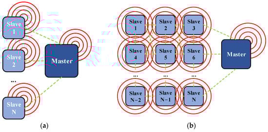 The general architectures of a wired BMS and a wBMS are presented in Figure 2. The wired BMS shown in Figure 2a typically includes multiple cell management units (CMUs), which are connected to a group of battery cells to monitor and control these cells; a central controller, often referred to as MCU, interfaces with CMUs via wired communication methods to manage the functionality of the system. In contrast, a wBMS, as shown in Figure 2b, eliminates physical connections and allows the CMU to interface with CMUs wirelessly.