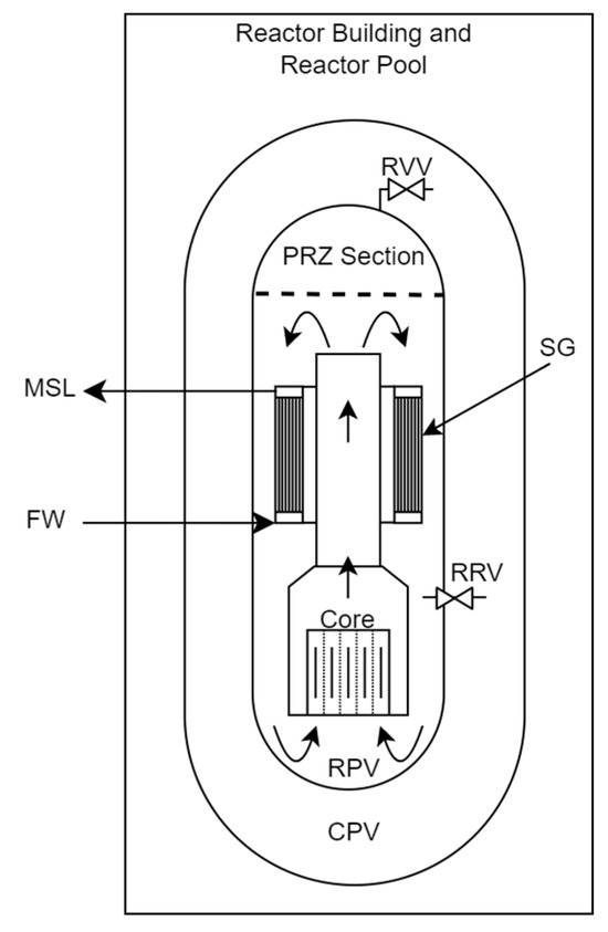 The generic iPWR investigated here has 160 MWth power and is equipped with compact helical SGs loops. The reactor pressure vessel (RPV) contains all essential elements of the reactor coolant system (RCS), such as the core, the pressurizer (PRZ), the primary side of SG, and the downcomer. Due to integral design, there is no hot or cold leg, which eliminates the possibility of large break LOCA (LBLOCA) and, therefore, eliminates some of the possible severe accident scenarios, e.g., unmitigated LBLOCA. The integral design presented here relies only on passive systems, convection, conduction, and natural circulation. There are no pumps or active systems on the primary side. The RPV is placed inside a second containment pressure vessel. The containment vessel’s initial condition is postulated in this study without water, in subatmospheric pressure, and it is submerged in a reactor pool (RP) placed inside a reactor building (RB). The generic design considered has a set of valves as a safety system called the emergency core cooling system (ECCS). In this study, the ECCS is a system composed of two groups of valves allowing coolant circulation between the RPV and the containment vessel during accident conditions. One group of valves is placed on the top of the PRZ and are called reactor ventilation valves (RVV), and the second group is placed slightly above the active core and are called the reactor recirculation valves (RRV).