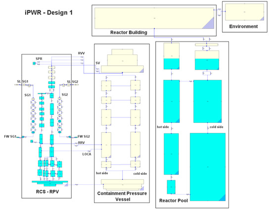 The MELCOR 2.2 input deck of the iPWR was developed based on the SASPAM-SA database, which was built based on publicly available information or the engineering assumptions summarized in [8,16,17]. This work will study LOCA-type accidents to examine code capabilities and the impact of the selected parameters on the quick depressurization sequence. For most of the necessary parameters, the authors tried to follow MELCOR best practices and guidelines [9,20,21,22], and if there were no strict guidelines about component modeling, engineering judgment was used to achieve the requested steady-state outcome and system stability. The input deck could be considered as a fine nodalization, complex model for relatively small geometry; it contains 79 control volumes (CVH), 116 flow paths (FL), and 62 heat structures (HS). To properly simulate steady-state and accident conditions, 256 control systems were used, including control functions (CF) and tabular functions (TF). The MELCOR model mimics the geometry of design one (and it is divided into four main areas: RPV, containment vessel, RP, and RB), which was also used by other researchers [23]; see Figure 1 and Figure 2. The input deck uses the eutectic model and the radionuclide (RN) package. The decay heat was defined based on the ANS 73 decay heat standard, scaled down to the investigated iPWR power.