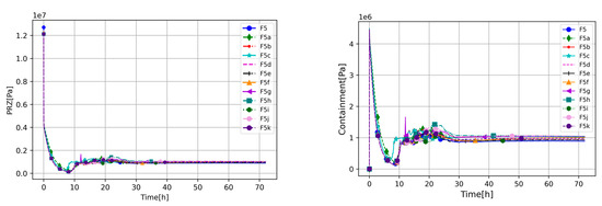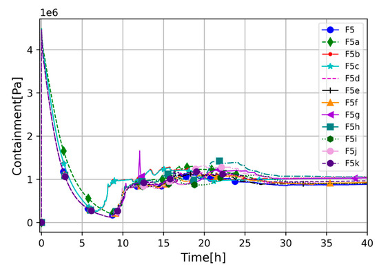 The open ventilation valve evacuates coolant from the RCS to the containment vessel, causing pressurization of the containment vessel, which reaches semi-equilibrium with the primary circuit almost immediately after initiating the event. The RCS pressure drops to about 4 MPa, which is also the maximum pressure reached by the containment vessel. From that point, the RCS and containment pressures have almost equalized, and they behave correspondingly to each other; see Figure 4 and Figure 5. Sensitivity cases F5b and F5c give slightly quicker and higher pressurization of the containment vessel between 7 and 10 h of being in the transient state. However, all cases behaved comparably to each other. The F5g showed increased pressure around 12 h, which is caused by intensive hydrogen generation at that time. One outlier occurred at around 21 h (F5h), and reached the visibly highest pressure in the post-core degradation phase. The higher pressure in the aforementioned case is related to the higher and more intense H2 generation caused by Zr oxidation. All investigated cases showed some differences in RCS and containment pressures; however, the differences are not significant, and pressure stabilized at around 1 MPa.